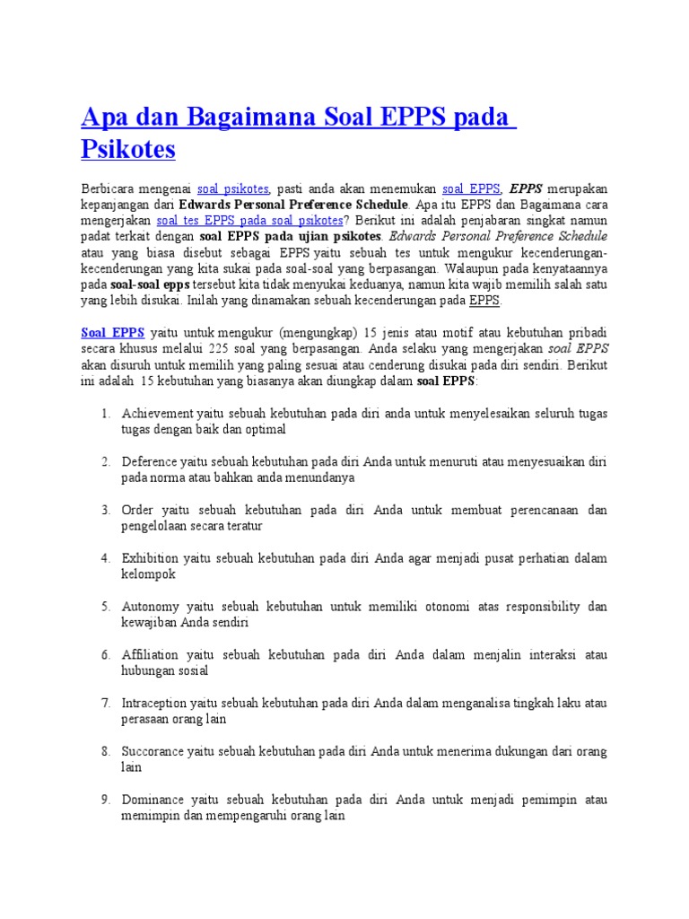 Jadi jawaban soal 26 harus sama dengan soal 101, soal 32 dengan 107, dst. Contoh soal ulangan harian matematika kelas 9 semester 1; Lembar jawaban epps format pdf 4. Cermati setiap pernyataan dan lakukan yang diminta penguji anda. Soal epps 225 pdf guru galeri. Tes edward personal preference schedule epps test merupakan alat tes untuk mengukur konsistensi tanggapan peserta cpns terhadap 15 kebutuhan normal maupun motivasi. Saya adalah pemimpin yang baik. Tips cepat mengerjakan soal 1. Admin blog contoh soal terbaru 24 january 2022 juga mengumpulkan gambar gambar lainnya terkait contoh tes epps dan jawabannya pdf dibawah ini. Cara sangat mudah mengerjakan soal tes psikotes pages 1 5 flip pdf download fliphtml5. Contoh soal psikotes epps pdf. Kami hanya menyebutkan 100 saja untuk memberikan gambaran jenis tes ini secara umum. Ane mau tanya, cara paling efektif ngerjain soal tes kepribadian epps yang junmlah soalnya 225 soal ntu gimana caranya?